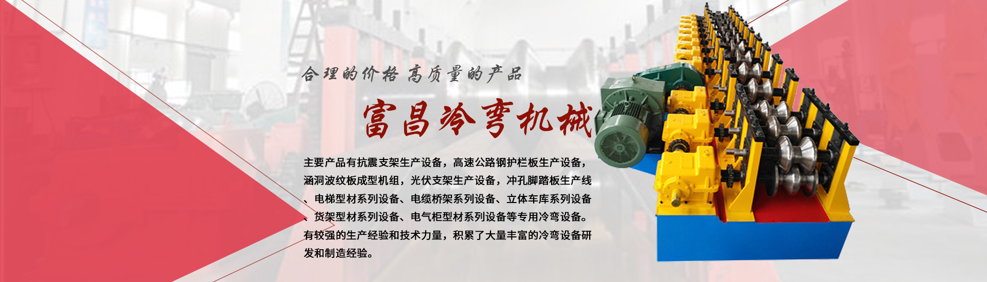 主要產(chǎn)品有抗震支架生產(chǎn)設(shè)備,高速公路鋼護(hù)欄板生產(chǎn)設(shè)備,涵洞波紋板成型機(jī)組,光伏支架生產(chǎn)設(shè)備,沖孔腳踏板生產(chǎn)線(xiàn)、電梯型材系列設(shè)備、電纜橋架系列設(shè)備、立體車(chē)庫(kù)系列設(shè)備、貨架型材系列設(shè)備、電氣柜型材系列設(shè)備等專(zhuān)用冷彎設(shè)備。有較強(qiáng)的生產(chǎn)經(jīng)驗(yàn)和技術(shù)力量,積累了大量豐富的冷彎設(shè)備研發(fā)和制造經(jīng)驗(yàn)。