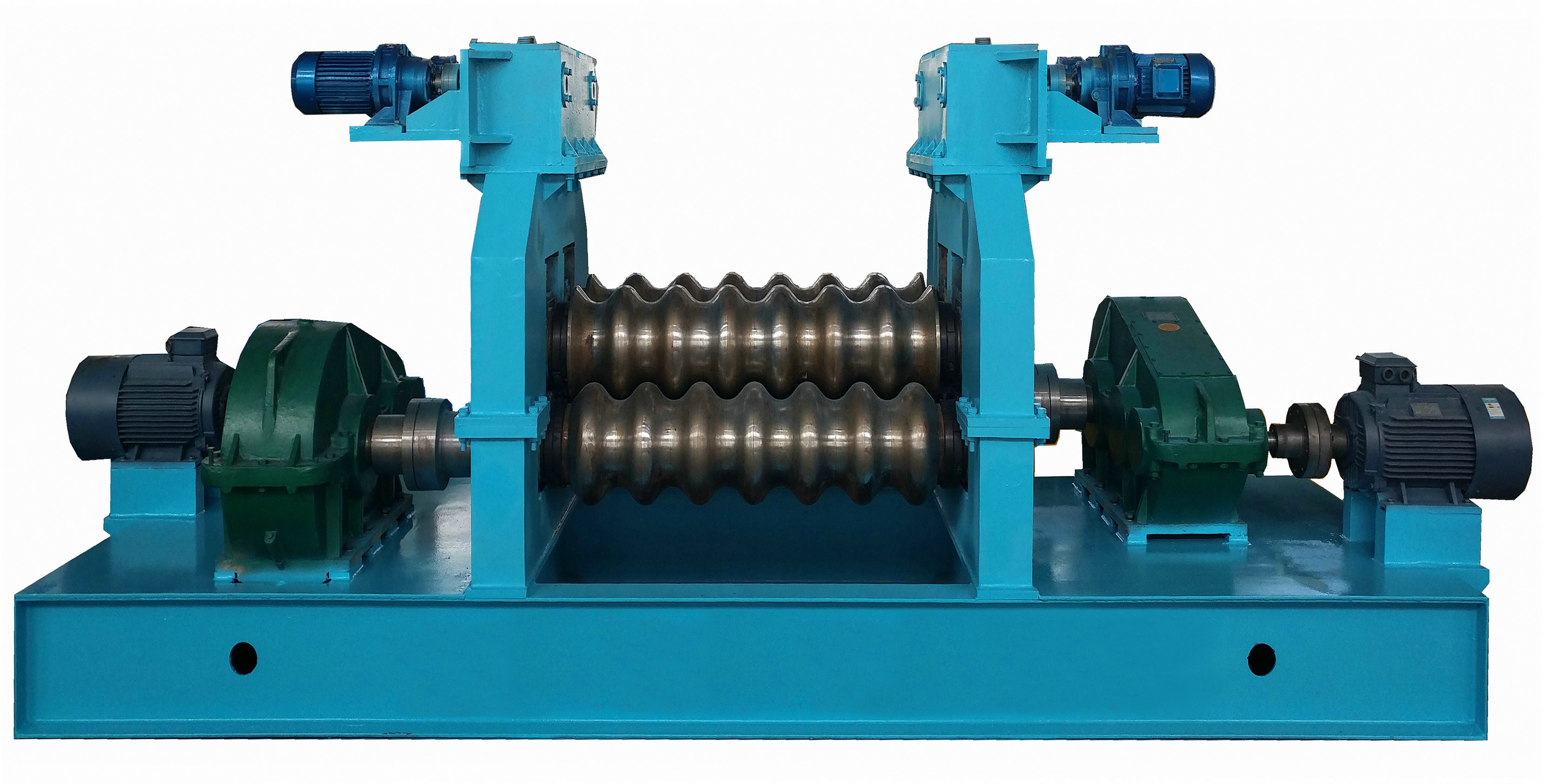 滾筒式進料平臺----四輥式波紋板彎弧機-----工件往復(fù)運動經(jīng)多次下壓----成品收料---電器控制系統(tǒng)